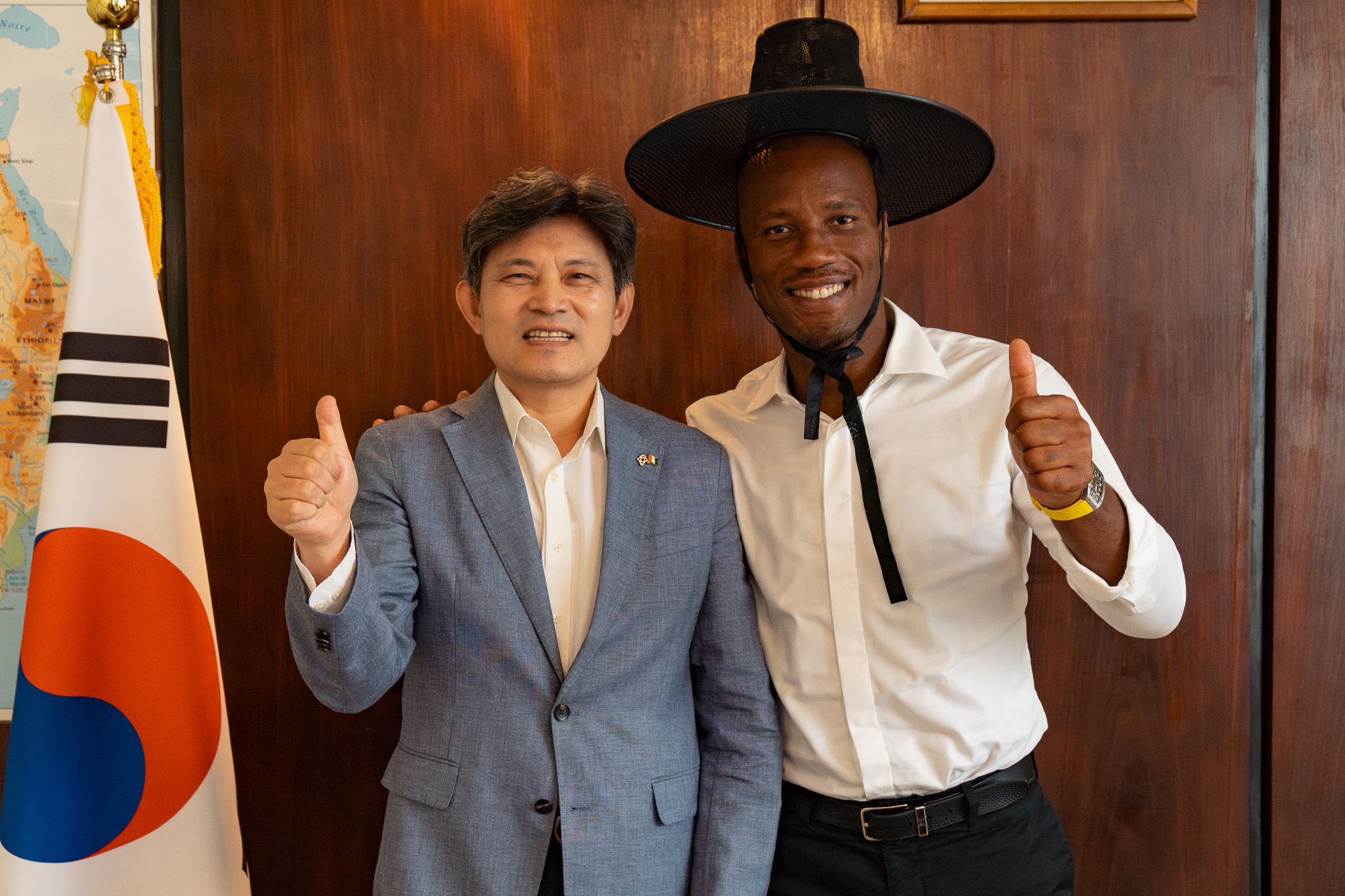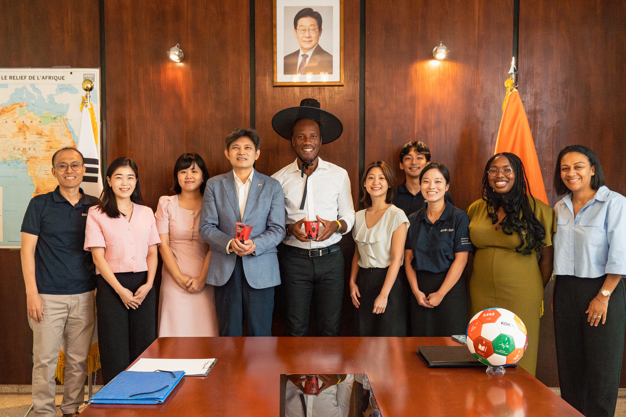 한편, 우리 대사관은 드록바 선수가 한국에서 “드록신”(드록바 + 신, 위대한 선수라는 의미로 한국 팬들이 붙여준 애칭)으로 불리는 것을 고려하여, 한국의 전통모자인 갓(gat)(발음이 ‘신’과 유사)과 특별 제작된 드록신라면을 선물하였습니다.