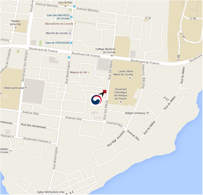 - Rue Sainte Marie, Lot 18-19, Cocody, Abidjan, Côte d’Ivoire (우편번호 : 01 B.P 3950)